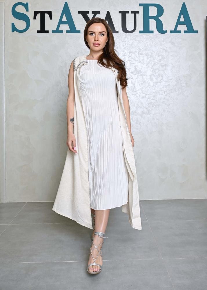 - نوع القماش: جاكار (Jacquard) ناعم وخفيف، بلون عاجي (Off-white/Ivory)القطعة الخارجية من الكريب الحريري.